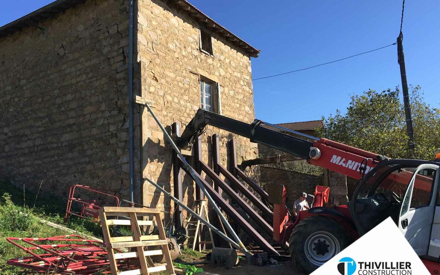 L’affaire consistait à renforcer la façade du pignon en pierres qui menaçait de s’effondrer. Nous avons étayé l’ensemble. Par la suite, nous avons réalisé des semelles filantes perpendiculaires à la façade. Nous avons mis en place des chaises métalliques assemblées avec des profilés type HEB 200. Pour terminer, nous avons mis un coulis de remplissage entre les pierres, et le profilé.